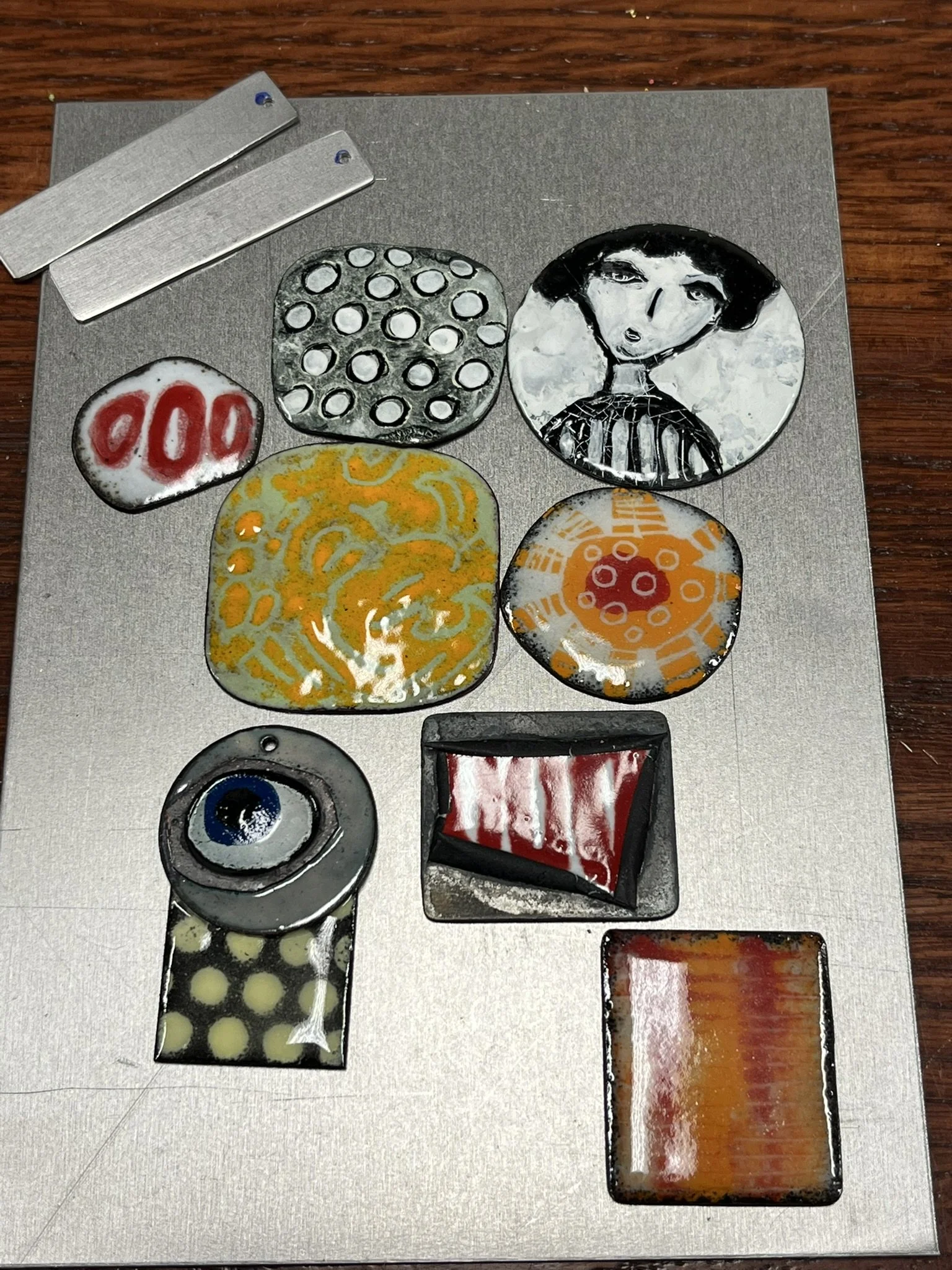 I have been dedicating most of my free time to learning enameling on copper and steel in the kiln. Enameling is one of those techniques that is super easy to do, but can be a lifetime of learning. There’s so much room for experimentation. When I first learned enameling in college, I had the attention span of a gnat and found the tedious cleaning of metal so boring I could cry. Fast forward 25 years and I’m finding it way easier (thanks to Kirsten Denbow, Sharon Massey, and Bette Barnett for enamel hacks and tricks to make it so much more efficient and fun).